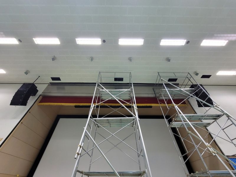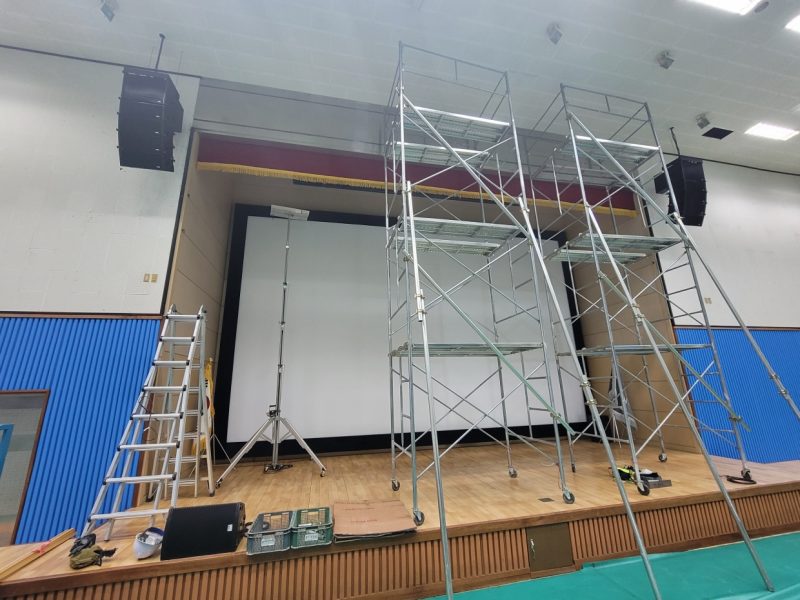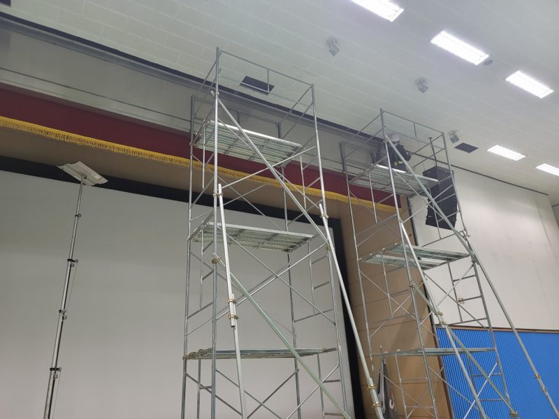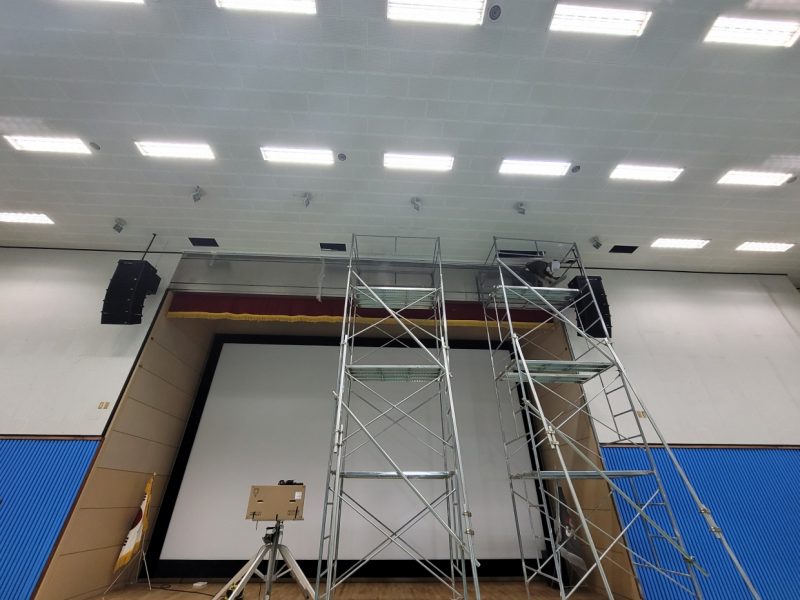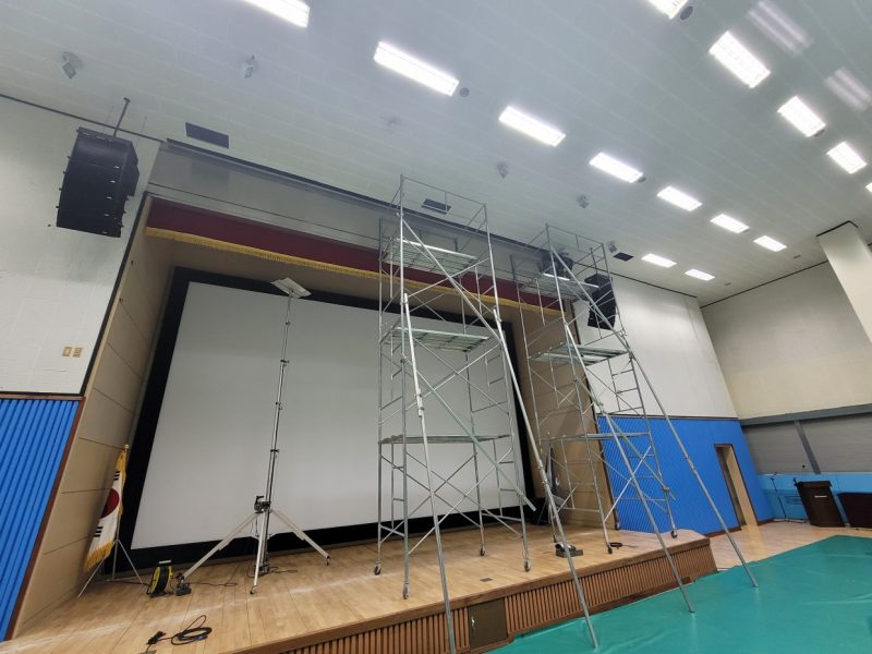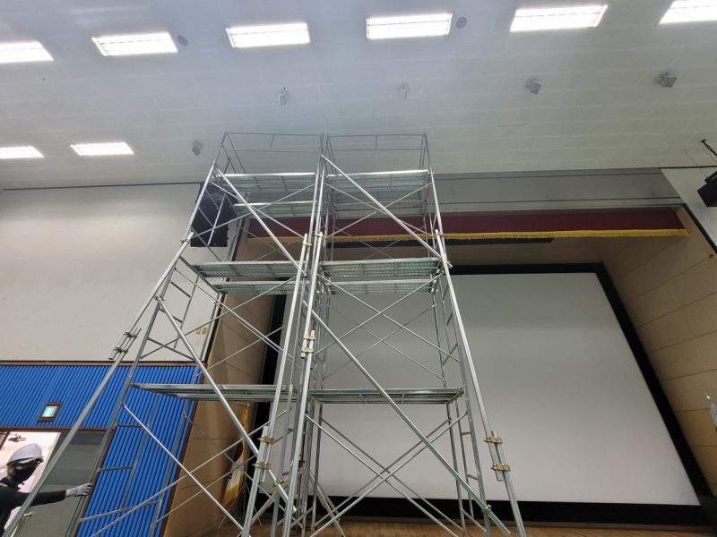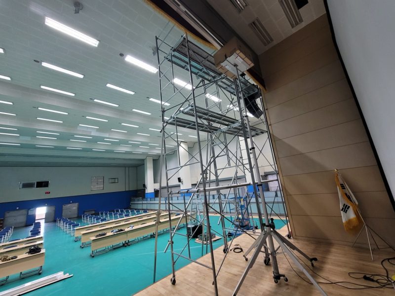 전동대형 현수막 길이가 9000이라 4500으로 두개를 연결을 해서 작업을 해야 하는 것도 난이도가 있지만 높이가  아시바 3단 위에서 연결을 해야 하는  더큰  난관들이 있었지만  항상 그렇듯  에이브이팀은  현장에서 만큼은 집중으로  결과를 만들어  증명합니다.