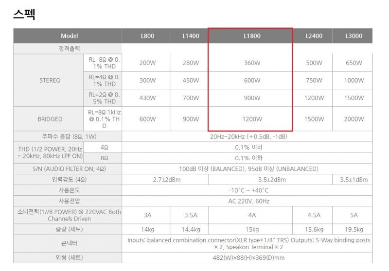 L-800/1400/1800/2400/3000은 2U 사이즈의 고출력 파워 앰프로