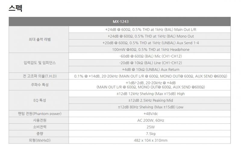 MX-1243 제품은 마이크, CDP 등 사용할 수 있는 12개 채널 입력과 4개의 보조 출력,